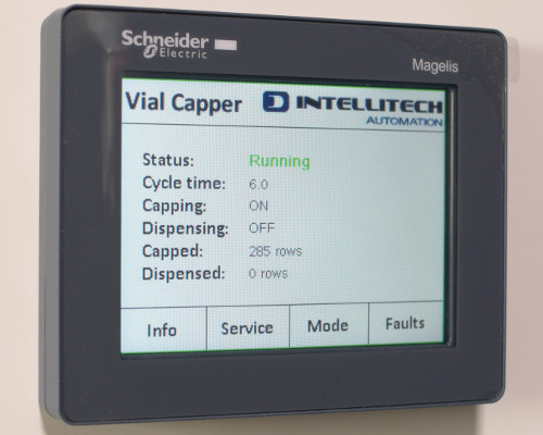 - Capped vial trays are stacked and then indexed out of the machine and onto the exit conveyor for removal