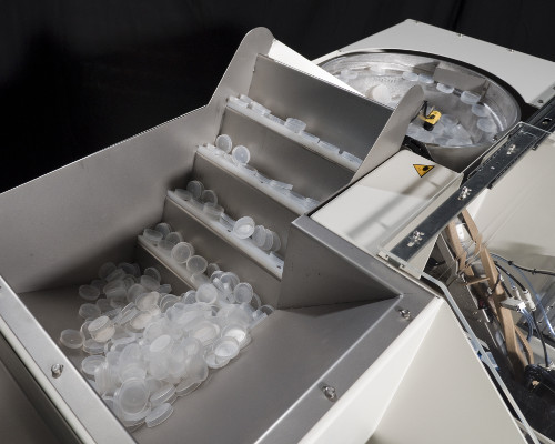 - Machine automatically dispenses incoming caps, loaded into hopper from top of the machine, into vibratory feeder allowing the caps to traverse into the capping device